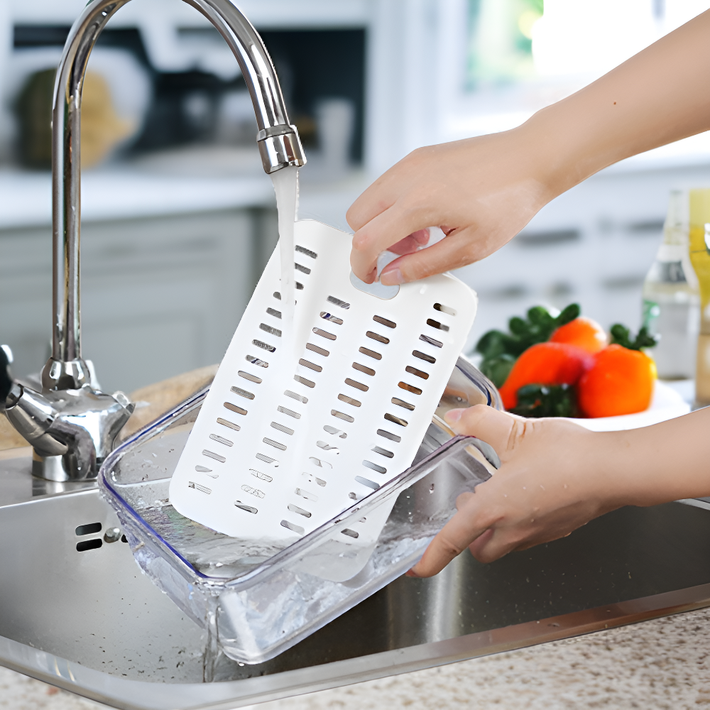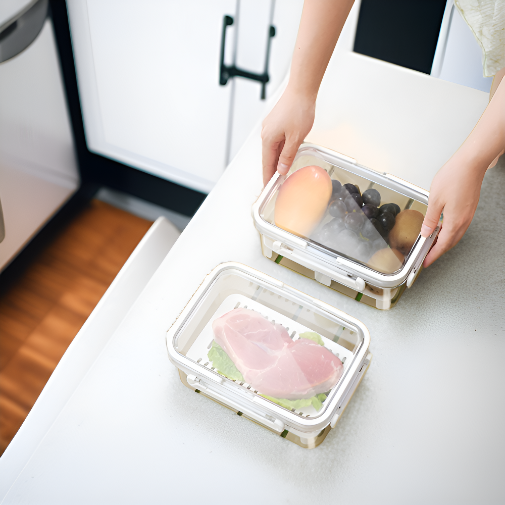 ● 이중층 구조로 물기를 효과적으로 배출하여 식품을 신선하게 보관할 수 있습니다. ● 내구성이 뛰어난 고품질 소재를 사용해 오랜 기간 변형 없이 사용할 수 있습니다. ● 다양한 크기의 식품 보관이 가능하며, 투명한 디자인으로 내용물을 쉽게 확인할 수 있습니다. ● 탈부착 가능한 배수 트레이로 세척이 간편하고 위생적으로 사용할 수 있습니다. ● 뚜껑이 밀폐되어 냄새가 외부로 새지 않아 냉장고 보관 시에도 안심할 수 있습니다.